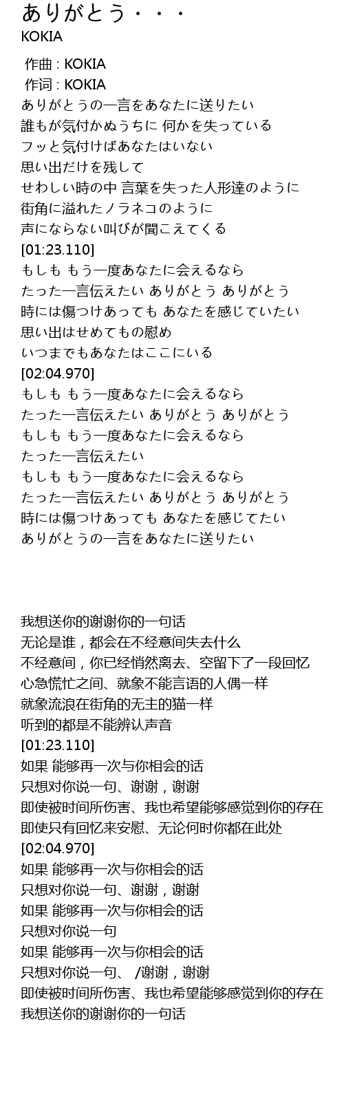 もしも もう一度あなたに会えるなら たった一言伝えたい ありがとう ありがとう 時には傷つけあっても あなたを感じてたい [Ti:ありがとう] [Ar:kokia] [Al:ありがとう] [By:stars.fearfully] [00:00.00]ありがとう /感謝 [00:01.76]作詞:Kokia 作曲:Kokia [00:03.64]編曲:日向敏文 [00:05.59]演唱:Kokia(吉田亞紀子) [00.